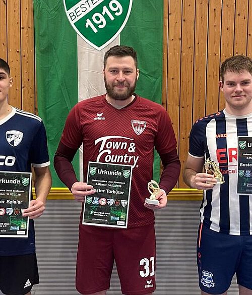 Bislang unentdeckte Talente offenbarte Peer Gülzow (Mitte), Ex-Spieler unserer 1. Männermannschaft und Trainer unserer F2-Junioren. Er wurde beim Hallenturnier des SV Grün-Weiß Union Bestensee (Sieger: Heideseer SV) zum besten Torhüter…