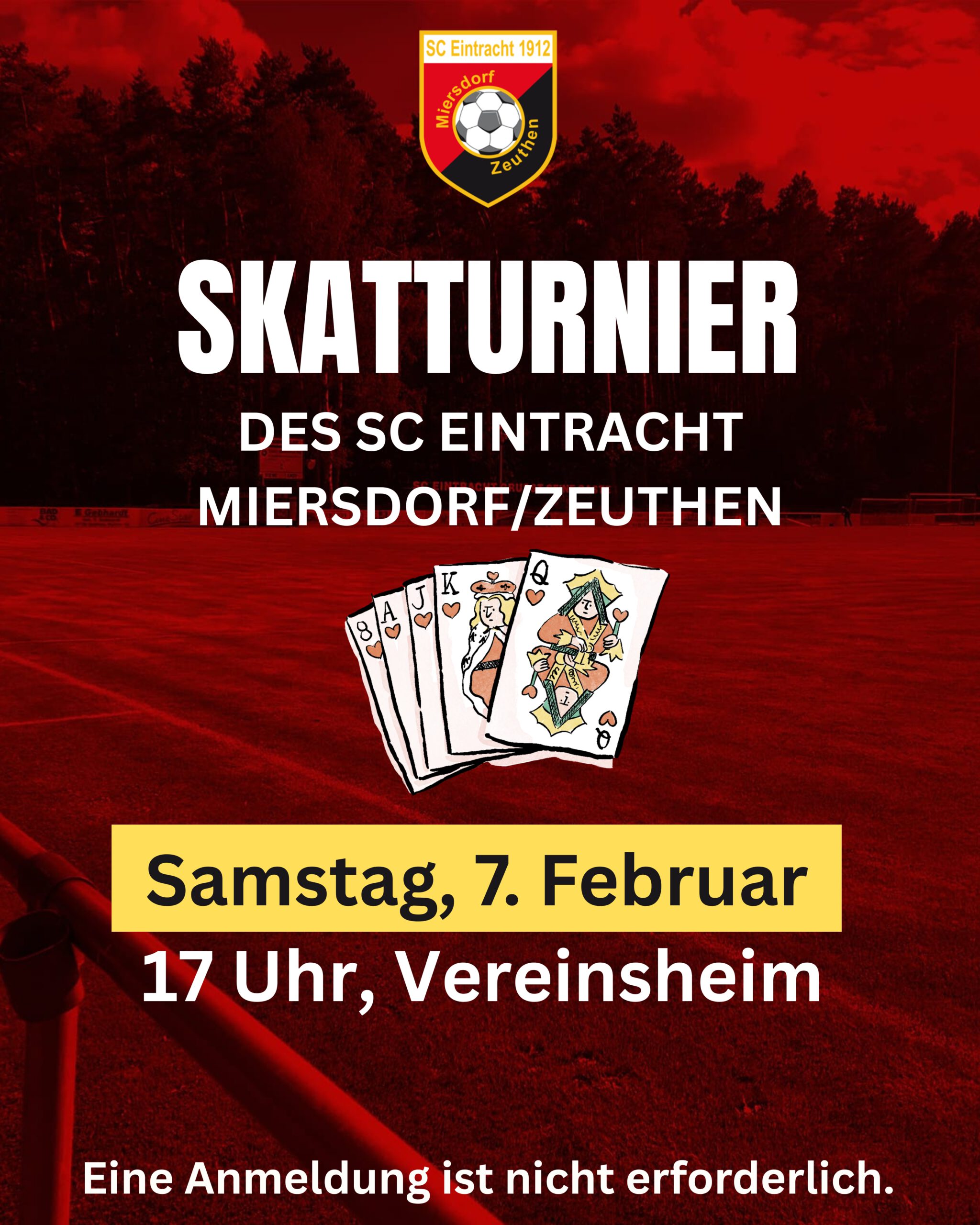 Skatfreunde aufgepasst! Nach dem Erfolg kurz nach Weihnachten steigt gleich am Samstag, 7. Februar, das nächste Skatturnier. Beginn ist um 17 Uhr im Vereinsheim. Eine Anmeldung ist nicht erforderlich.