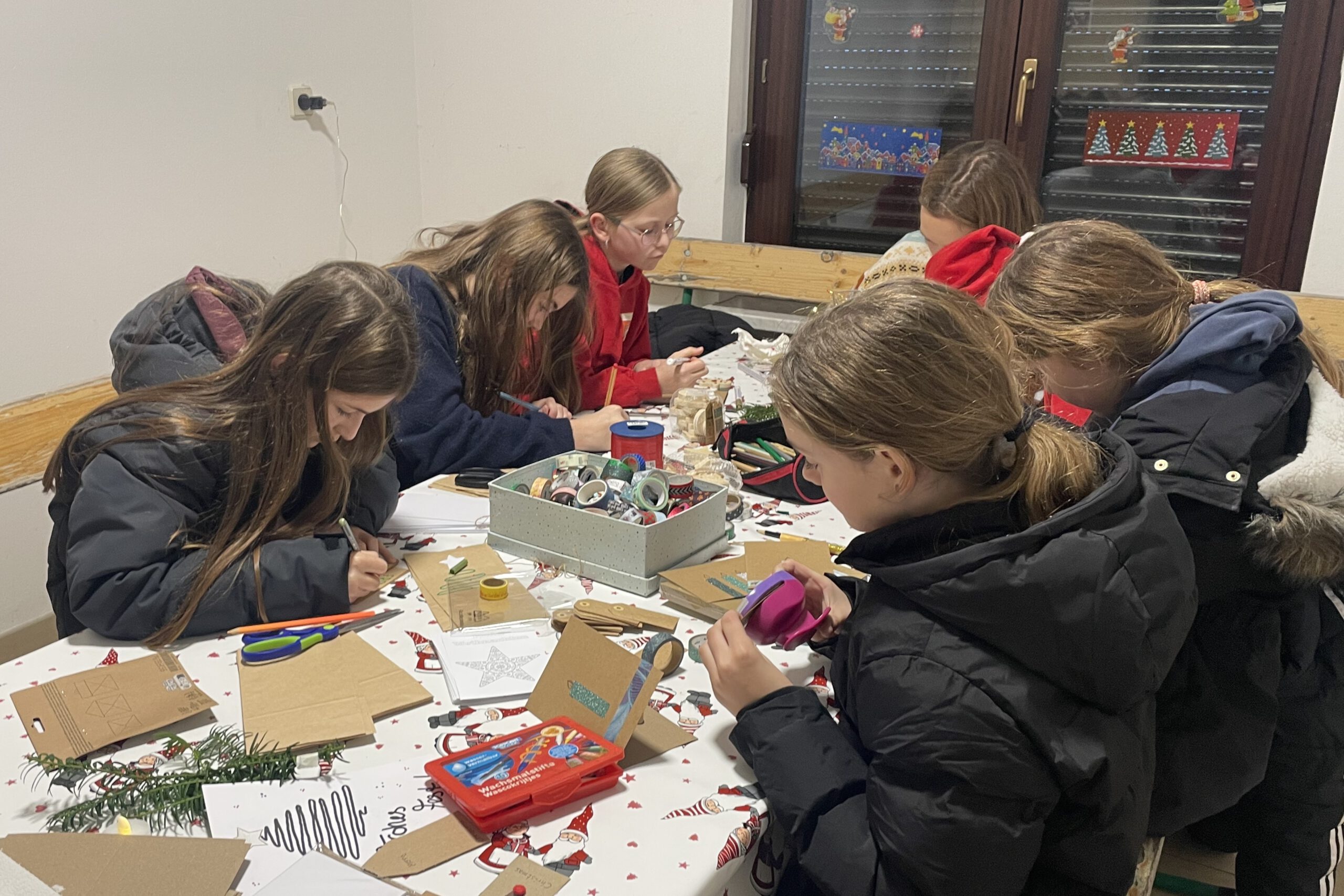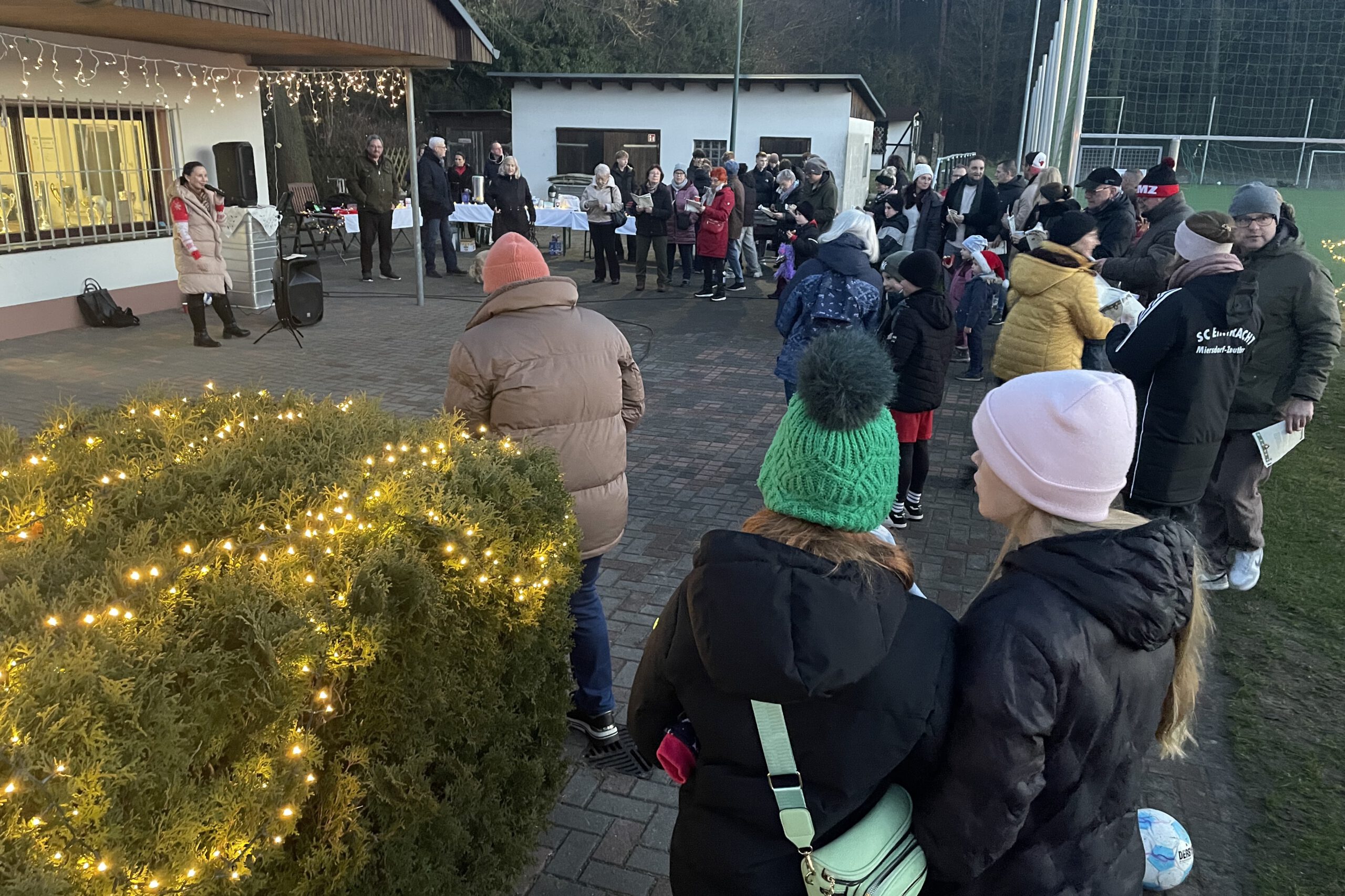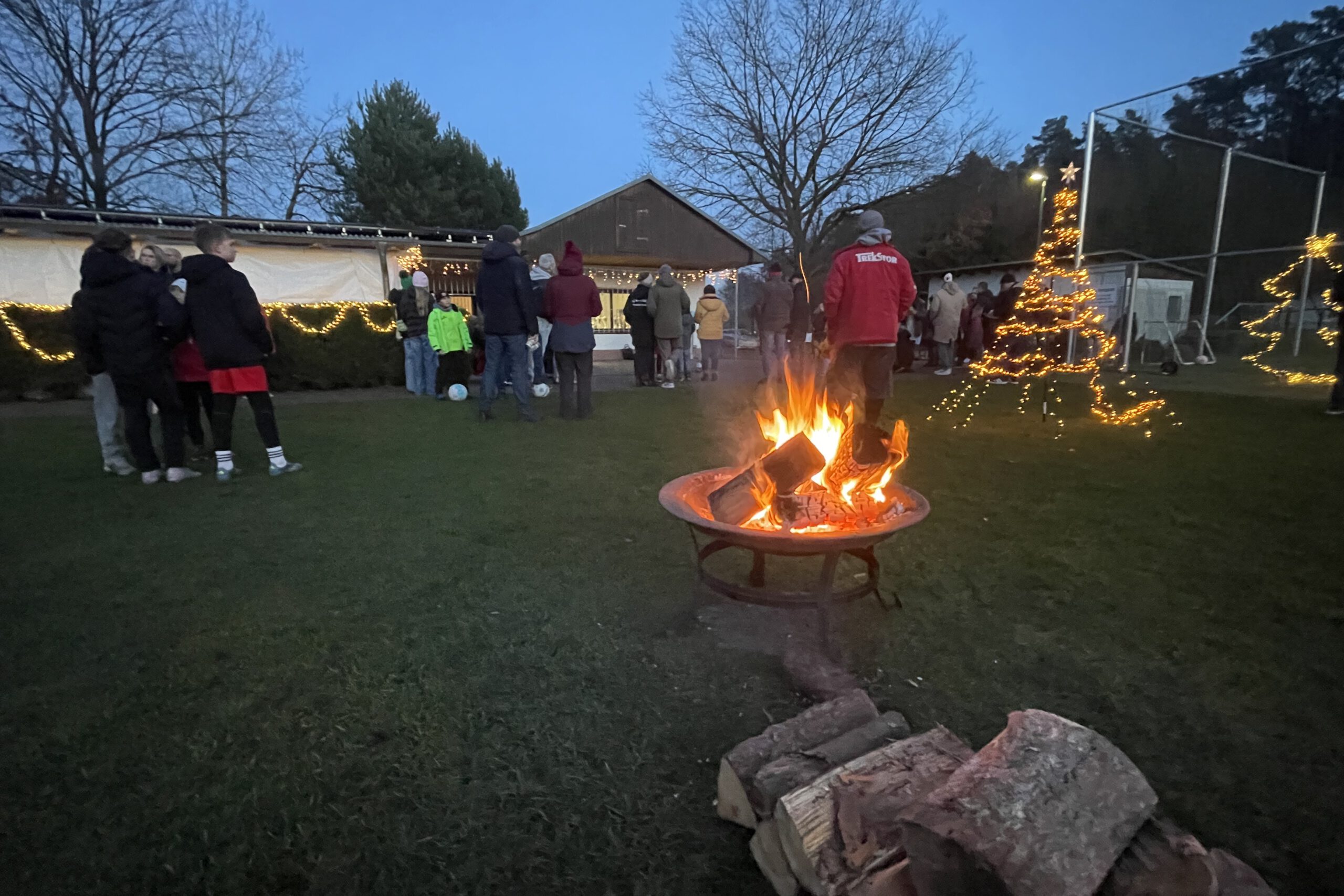 Viele Kinder, Jugendliche, Trainer, Eltern und Großeltern fanden sich am Freitagnachmittag zur Weihnactsfeier auf dem Einracht-Gelände ein. Der Platz war festlich geschmückt mit Lichterketten und Feuerschalen, es gab Grillwürstchen, Kinderpunsch, Glühwein und Kaffee. Die Kinder konnten Plätzchen bemalen und Weihnachtskarten basteln.