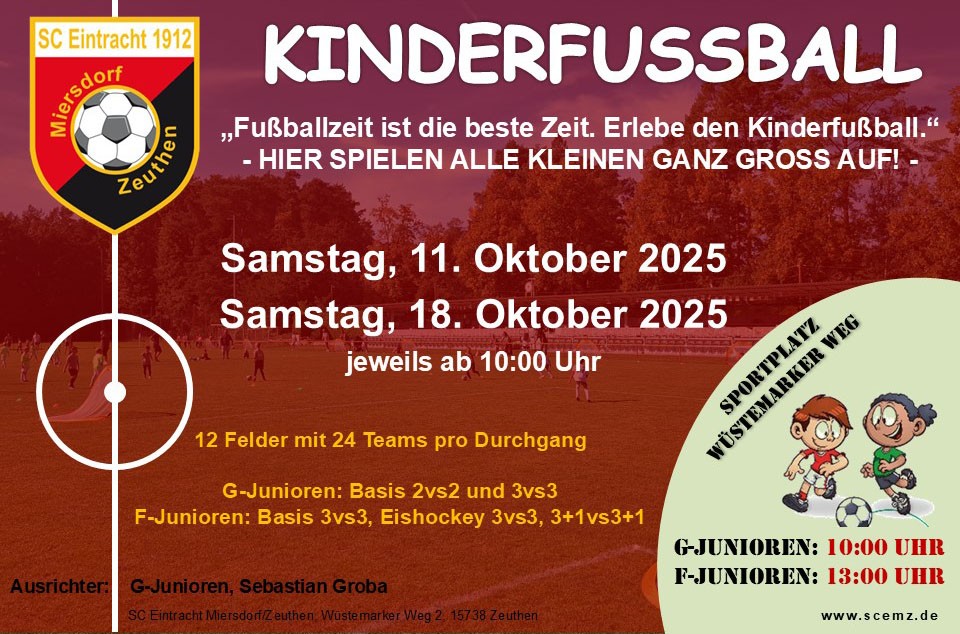 • Um 13 Uhr duellieren sich  die F-Junioren (Jahrgänge 2017 und 2018) auf 5 Spielfeldern mit 10 Teams in verschiedenen Spielvarianten wie z.B. 3 gegen 3 Basis oder Eishockey sowie 3+1 gegen 3+1. Mit dabei sind Union Bestensee der SV Rangsdorf, der BSC Preußen 07 und die Eintracht.