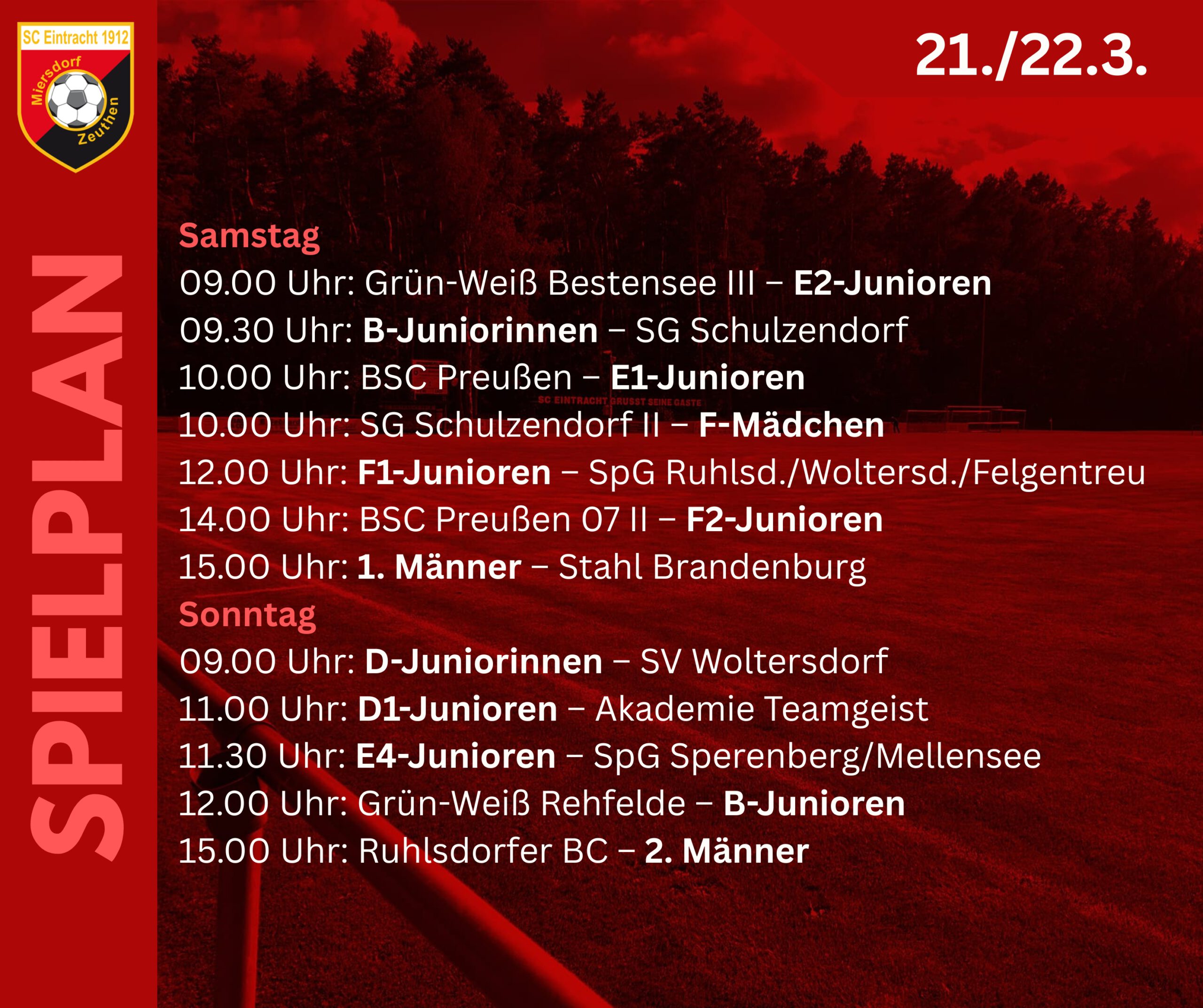 Unsere beiden Landesliga-Mädchenteams haben Heimspiele: Die B-Juniorinnen erwarten bereits am Samstag zum Derby die SG Schulzendorf, die D-Juniorinnen stehen am Sonntag dem SV 1919 Woltersdorf gegenüber.